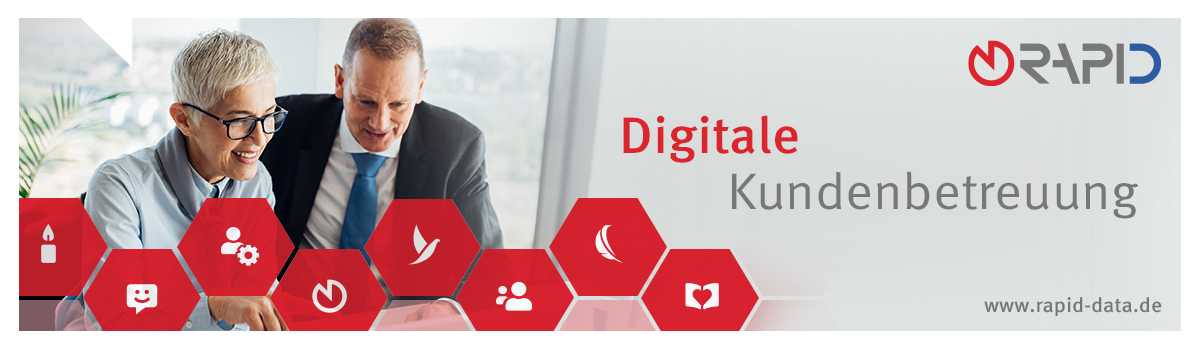 „Das fachliche Know-how und die persönliche Betreuung liegen natürlich immer beim Bestatter. Gut durchdachte Online-Services sind aber eine Chance, Kunden das besondere Extra zu bieten und die Leistungen des Bestatters sichtbar zu machen“, weiß Gisa Greve, Marketingexpertin bei Rapid Data, nur zu gut. Mit dem PowerOrdo Kunden-Center hat Rapid Data eine digitale Trauerfallhilfe entwickelt, die einen stetigen Dialog zwischen Auftraggeber und Bestatter ermöglicht. Über einen persönlichen Zugang können Angehörige per Mausklick wichtige Dinge rund um den Trauerfall regeln, Erinnerungen an den Verstorbenen bewahren und auch ihre Trauerdrucksachen ganz einfach mit dem Bestattungshaus abstimmen.