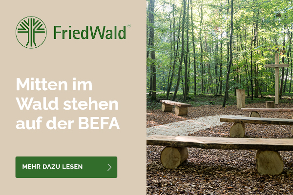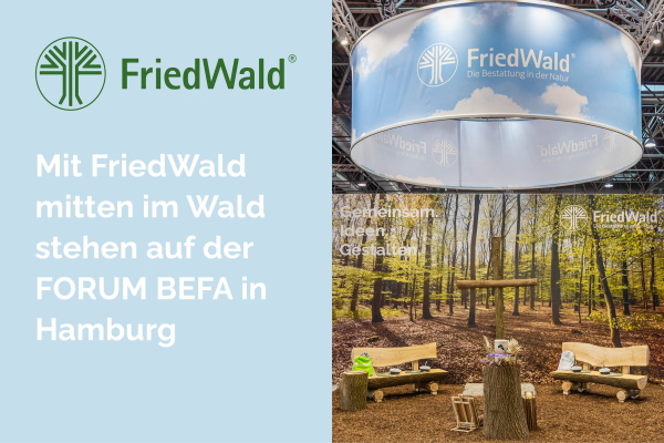 Am 28. und 29. März holt FriedWald auf der FORUM BEFA in Hamburg den Wald in die Messe-Halle. Erleben Sie inmitten unseres nachgebauten Andachtsplatzes – dem z…