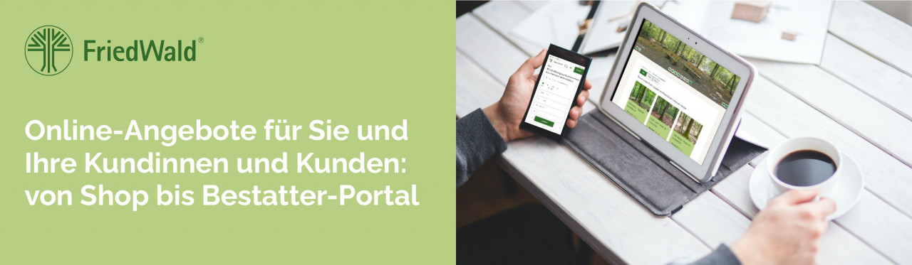 Nicht immer ist ein Besuch vor Ort im FriedWald möglich, um die Bestattung in der Natur kennenzulernen und in einem persönlichen Termin mit einer FriedWald-Försterin oder einem FriedWald-Förster den passenden Baum für die letzte Ruhe auszusuchen. Hilfreich sind dann Onlineangebote wie der FriedWald-Onlineshop und die Baumsuche auf der FriedWald-Website. Mit dem FriedWald-Portal für Bestattungshäuser unterstützen wir Sie in Ihren Abläufen rund um eine Beisetzung im FriedWald.
