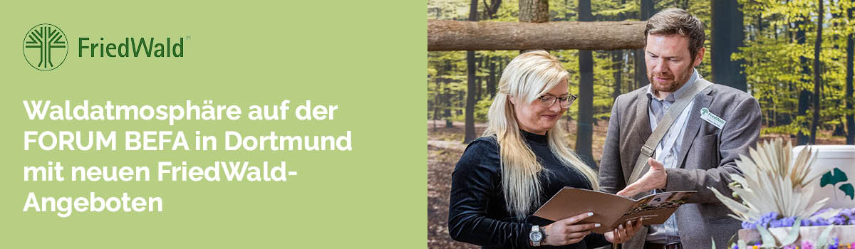Die Bestattung im Wald wird immer beliebter. Laut einer Studie von Aeternitas im Jahr 2022 liegt die Beisetzung in einem Bestattungswald auf Platz 1 der meistgewünschten Bestattungsarten. Wie Sie als Bestatterinnen und Bestatter bestmöglich auf die Wünsche nach der letzten Ruhe im FriedWald eingehen und diese umsetzen können, erfahren Sie am FriedWald-Messestand auf der FORUM BEFA in Dortmund vom 12. bis zum 13. April 2024.