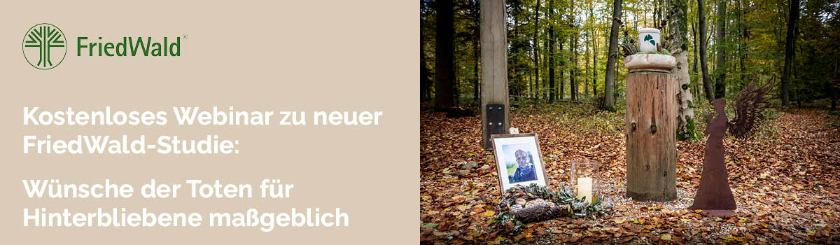 Selbstbestimmt oder fremdgesteuert? Wer entscheidet über das Wie und Wo einer Beisetzung? Was darf eine Bestattung kosten? Diesen Fragen ist FriedWald gemeinsam mit dem Marktforschungsinstitut rheingold aus Köln auf den Grund gegangen. Im kostenlosen Webinar von FORUM BEFA und FriedWald stellen wir Ihnen am 13. November die Ergebnisse der repräsentativen neuen FriedWald-Studie vor. Erfahren Sie, welche Motive Hinterbliebene bei der Wahl der Bestattungsform haben und wie Angehörige die Rolle der Bestatterin bzw. des Bestatters wahrnehmen.