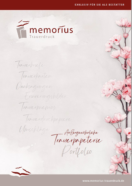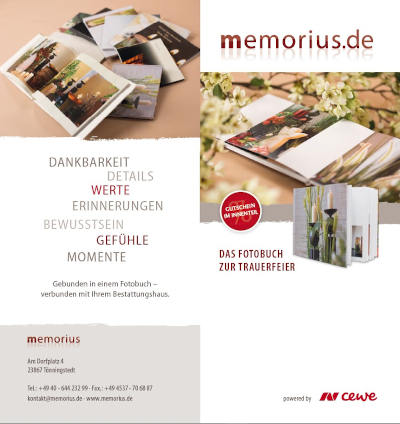 memorius bietet hochwertige Trauerdrucksachen speziell für die Bestattungsbranche. Gestalten Sie mit maßgeschneiderten Online-Tools ganz einfach eindrucksvolle Produkte - in Profiqualität. memorius Trauerdruck - das bevorzugte Werkzeug für die Erstellung einer sensiblen und einfühlsamen Traurdrucksache für Ihre Kunden. MIt edler Haptik, berührenden Motiven und exellentem Service. Einfach selbst gestalten und direkt online drucken lassen. Sie können auch alle Ihre Projekte abspeichern und zu einem späteren Zeitpunkt von überall her wieder aufrufen. So können Sie eigene Vorlagen erstellen, die Sie beim nächsten Mal einfach anpassen oder mit den Angehörigen das gestaltete Produkt per Abstimmungs-PDF besprechen und danach erst bestellen.www.memorius-trauerdruck.de . memorius Trauerfotobuch - Bieten Sie Ihren Kunden mehr als nur Erinnerungen an. Ihre Arbeit als Bestatter endet nicht nach der Trauerfeier. Geben Sie den Angehörigen die Erinnerungen an einen geliebten Menschen mit auf den Weg und bleiben selbst in Erinnerung. Die Trauerfeier ist Teil eines Abschiedsprozesses, der für eine heilsame Wandlung von Trauer in neue Lebensfreude steht. Dabei sind Erinnerungen in Form von Fotos ein wesentlicher Bestandteil. Dabei bedarf es keinen professionellen Fotografen oder eine komplizierte Fotobearbeitung. Wahrscheinlich haben Sie in der Vergangenheit schon Fotos gemacht. Statt dem Bestellen und Abholen von Ihren Fotos und dem Aufbereiten in einer Überreichungsmappe bieten wir Ihnen einen sehr komfortablen Service.