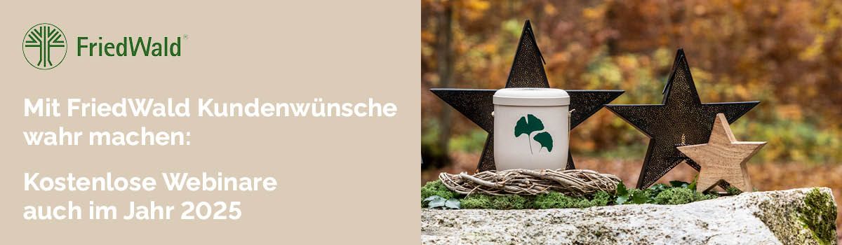 Unser erstes Webinar für 2025 ist am 16. Januar von 15 bis 16 Uhr und gibt Ihnen Einblicke in das Angebot und den Service von FriedWald. Wir stellen Ihnen alle Produkte und Preise vor und zeigen Ihnen, wie Sie für und mit Ihren Kundinnen und Kunden den Baum für die letzte Ruhe auswählen.Und im August dreht sich alles um das Thema Werbeunterstützung: von Ausstattungsmöglichkeiten für Ihr Bestattungshaus über Social Media Nutzung bis hin zu Vorsorgeveranstaltungen.