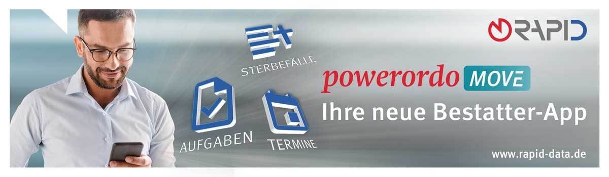 Ob morgens beim Frühstück oder mittags auf dem Friedhof – von nun an haben Sie mit der neuen Bestatter-App PowerOrdoMOVE von Rapid Data jederzeit und überall Termine, Aufgaben, Kontakte und Infos zu den Sterbefällen auf dem Smartphone parat. So sind Sie und Ihr Team auch außerhalb Ihres Büros bestens organisiert! Dieses neue mobile Arbeiten bedeutet für alle in Ihrem Bestattungshaus: mehr Transparenz und Überblick, bessere Zusammenarbeit, höhere Effizienz und vor allem das gute Gefühl, jederzeit und überall alles im Griff zu haben!