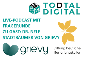 Im Podcast TODTAL DIGITAL der Stiftung Deutsche Bestattungskultur sprechen Dr. Jörg Noll und Dr. Simon Walter mit unterschiedlichsten Gästen, die etwas zu digitalen Entwicklungen in Bestattungskultur und Bestattungsbranche zu sagen haben. Die Aufnahme der neuesten Folge wird live gestreamt und anschließend wie gewohnt als Podcast zur Verfügung gestellt. Zu Gast ist Dr. Nele Stadtbäumer mit Neuigkeiten rund um die App grievy. Im Anschluss an das Gespräch haben die Zuschauerinnen und Zuschauer die Möglichkeit, Fragen zu stellen, die wir ebenfalls aufnehmen und in den Podcast integrieren.